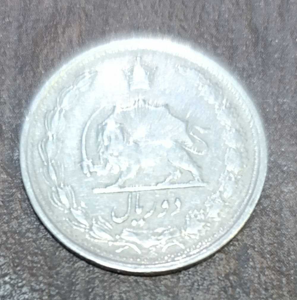 روی سکه 2 ریال محمدرضا شاه پهلوی شاهنشاه ایران برگ زیتون و برگ بلوط تاج تاریخ پشت سکه برگ زیتون و برگ بلوط شیر و خورشید تاج دو ریال